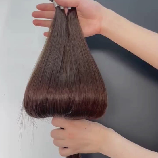 Giv dit hår dybde og elegant fylde med vores Flat Tip Keratin Extensions i farve #4 Dark Brown Chocolate. Denne nuance har en varm, chokoladebrun tone, der er perfekt til dem, der ønsker et naturligt, klassisk brunt look med glans og dybde.
